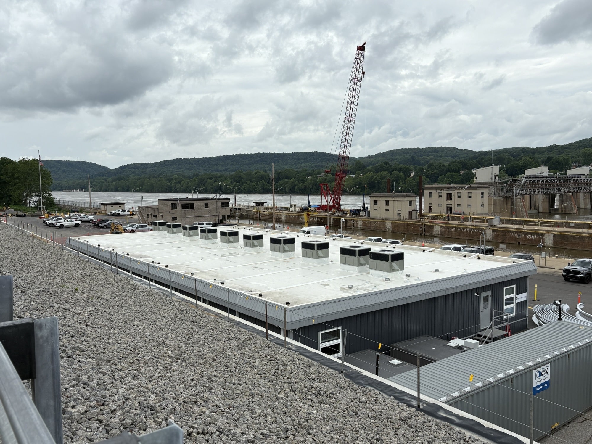 Triumph Modular provided a 7,200-square-foot, 10-unit modular construction office for Trumbull-Brayman Joint Ventures at the Montgomery New River Chamber Lock and Dam project near Monaca, PA, supporting a decade-long infrastructure upgrade along the Ohio River. The client required more than a standard trailer, seeking a permanent, comfortable, and light-filled operations hub to enhance daily workflow and support the long-term project’s needs.